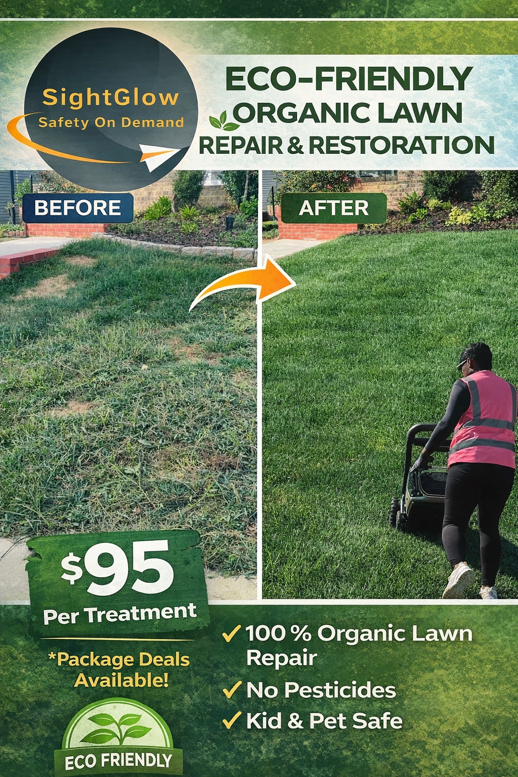 SightGlow Safety On Demand organic lawn restoration portfolio showcasing certified organic overseeding, soil compaction correction, natural crabgrass suppression services and bi-weekly maintainence services in Quantico and Northern Virginia.